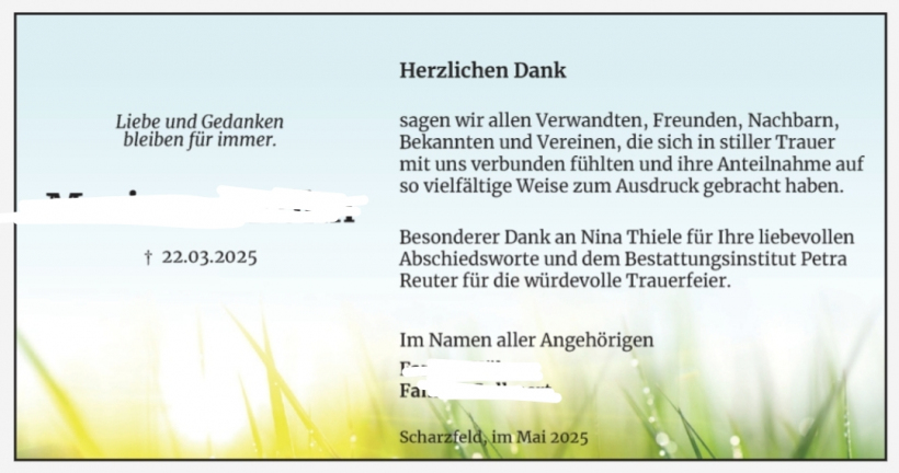 Hierbei kann es auch viele helfende Trauerrituale geben, persönliche Musikwünsche, Beiträge der Familie